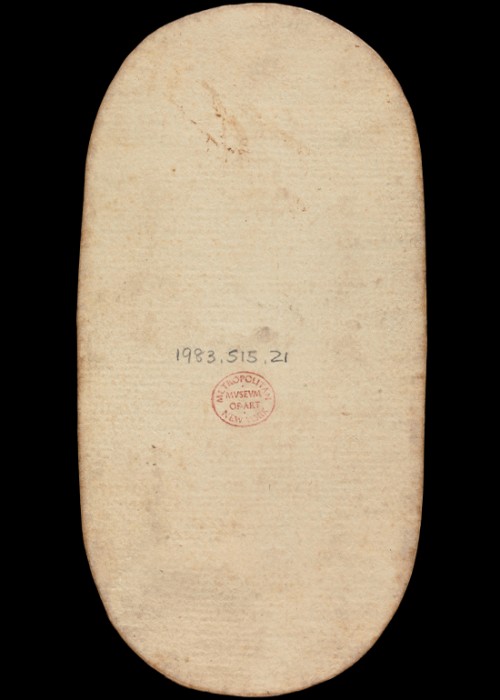 The Cloisters set of fifty-two cards constitutes the only known complete deck of illuminated ordinary playing cards (as opposed to tarot cards) from the fifteenth century. There are four suits, each consisting of a king, queen, knave, and ten pip cards. The suit symbols, based on equipment associated with the hunt, are hunting horns, dog collars, hound tethers, and game nooses. The value of the pip cards is indicated by appropriate repetitions of the suit symbol. The figures, which appear to be based on Franco-Flemish models, were drawn in a bold, free, and engaging, if somewhat unrefined, hand. Their exaggerated and sometimes anachronistic costumes suggest a lampoon of extravagant Burgundian court fashions. Although some period card games are named, it is not known how they were played. Almost all card games did, however, involve some form of gambling. The condition of the set indicates that the cards were hardly used, if at all. It is possible that they were conceived as a collector’s curiosity rather than a deck for play.