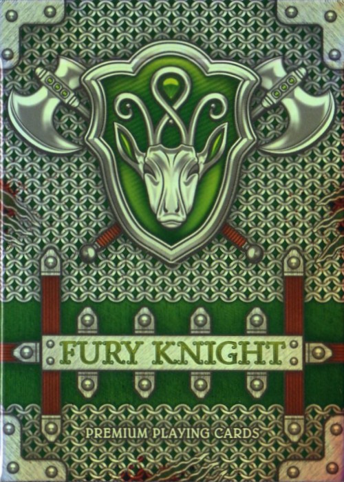 The designs for the Knights Tucks incorporate a Chainmail background for the Fury, and an Etched Armour background for the Rage. The Fury Deck features a green accented shield and a Stag Head for his crest. The Rage Deck features an amber accented shield and a Bull Head for his crest. Each design includes its Knight's preferred style of weaponry - Battle Mace for the Rage Knight, Medieval Axe for the Fury Knight (sorry fellow GOT fans, no Ice-Tipped Spear). For a closer look, here's a couple links to the Rage Knight and Fury Knight Tuck flats.
