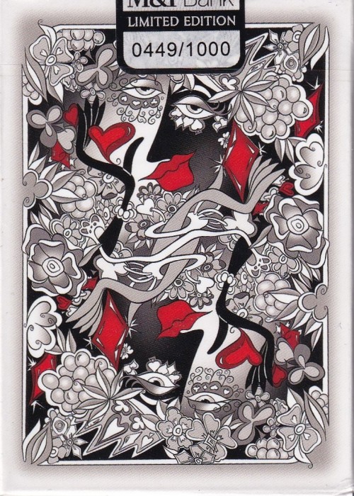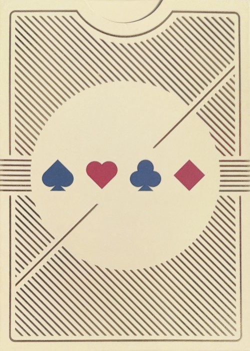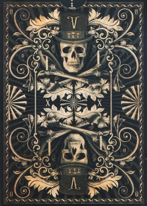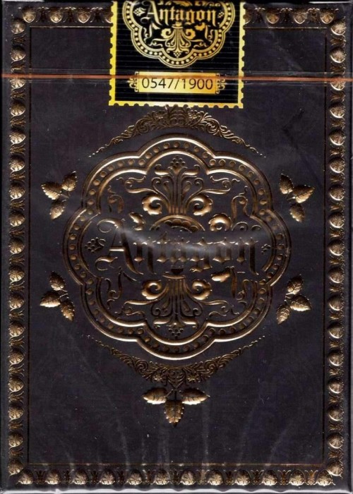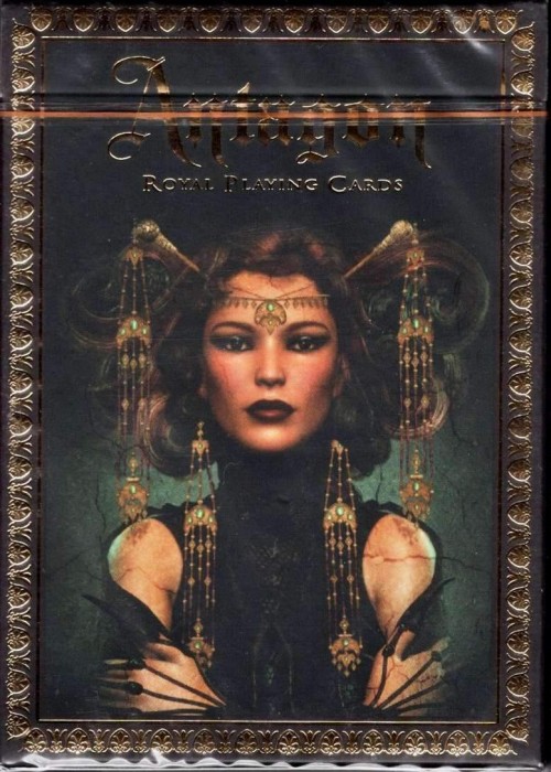 Antagon Royal Playing Cards, designed by SixtyFourPlayingCards, is a unique and elegant deck of playing cards for collectors, where the Court and the cards are all created with an original design. It is a limited and numbered edition. The tuck case is very luxurious with embossing and foil. The numbered cards are delicate, and this worn background reinforces their medieval inspiration. The back shows a traditional intricate design made with natural shapes.