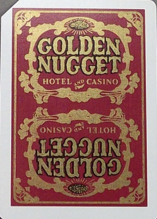 Golden Nugget are the second most famous vintage casino cards (after Jerry\\\'s Nugget). Produced since 1962 they have the most number of colors: Orange, Red, Purple, Black, Blue, Green, Brown, Red/Gold, Green/Gold, Gold/Black, Black/Gold (11 colors and 2 variant of 2 colors). The rarest are 1st run in Purple and Blue with 1-pack tax stamp (produced before June 22, 1965) and Orange deck.
