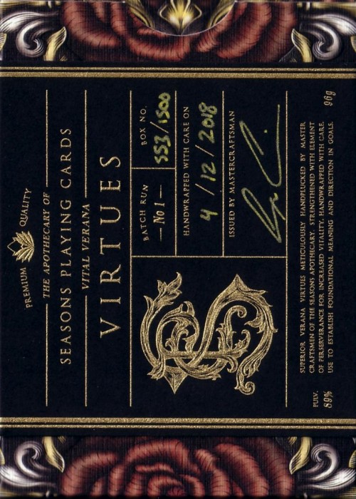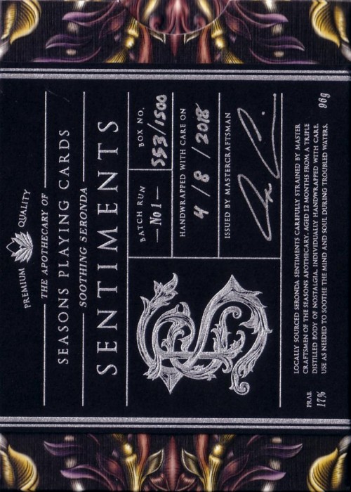 As a result, these decks are known as the 'Prototype and Thanks' edition and can be identified by the white label (vs black on original decks), the signature & hand numbering inside the tuck and custom gilding color which will vary within each set of 60. Could include known green, but also possibly include gold, silver, red, etc. While originally created in 2016 to prepare for the first Apothecary decks, they were not distributed until starting in 2018.
