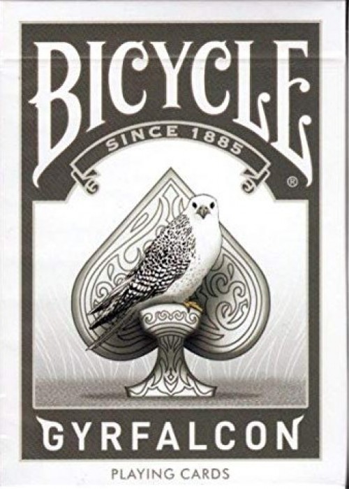Funded through a Kickstarter campaign https://www.kickstarter.com/projects/2104052526/bicycle-limited-edition-gyrfalcon-playing-cards This formidable predator, the largest falcon in the world, reigns over barren tundra and desolate coasts in the high Arctic. There it preys mostly on large birds such as ptarmigan and waterfowl, overtaking them in powerful flight. Most Gyrfalcons remain in the far north all year; only a few come as far south as the Canadian border in winter, providing thrills for birders. Variable in color, Gyrs may be blackish, gray, or stunningly white.