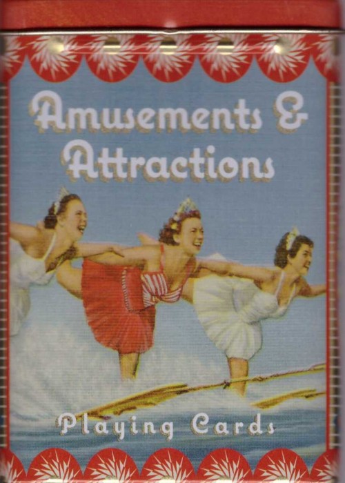 Facsimile produced exclusively for Murdoch\'s Gem Shop, Whitehorse, Yukon Territory, Canada. This deck is a reproduction of one of four different decks which were made for the White Pass & Yukon Train Route. There are 52 cards, each featuring an oval photo scene from along the route, and one Table of Distances card with a map of the route on the reverse. Included is a leaflet telling the story of the times. In the year 1898 the greatest gold rush the world has ever seen took place. It has been estimated that 100,000 people worldwide started out, and 30,000 of them actually reached Dawson City. To accomodate the gold seekers White Pass built a 110 mile narrow gauge railaroad, that had been called impossible, through the 3,000 foot high White Pass in the coastal mountains. Two years later a fleet of sternwheel river boats were added to the transportation system and the playing cards reproduced here were provided to the passengers. Ace of Hearts - shows the arrival of the first passenger train at the summit on Feb. 20, 1899. King of Hearts - shows the stop at \'Clifton\'. Queen of Hearts - shows the train on the \'Trestle over Glacier Gorge at Tunnel\'. Jack of Hearts - shows the train \'Near the Tunnel\'. Ace of Clubs - shows a train car underneath the \'Hanging Rocks of Clifton\'. King of Clubs - shows the \'First Passenger Train Over Summit\', Feb. 20, 1899. Train stopped on trestle before entering tunnel. Queen of Clubs - shows \'East Fork from Rocky Point\'. Jack of Clubs - shows a scene of men working on the railroad. Ace of Diamonds - shows \'A stop\' at the summit with passengers waiting to board. King of Diamonds - shows the train \'Approaching Skagway\'. Queen of Diamonds - shows a view leaving the tunnel, \'Looking South from Tunnel\'. Jack of Diamonds - shows the train stopped at \"rocky Point\'. The Ace of Spades - shows the train with two steam engines with the caption \'White Pass and Yukon Express\'. It is in black and white. King of Spades - shows the train on a trestle with the caption \'Among the Clouds\'. Queen of Spades - shows the train with a flatcar of early sightseers with the caption
