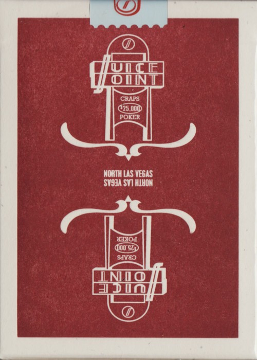 The Jucy Joint deck features a custom tuck, mirrored card backs, and Ace of Spades. Since this is a casino-inspired deck, the pips, indices, and courts are pretty much standard. Fans of vintage casino decks will not be disappointed!