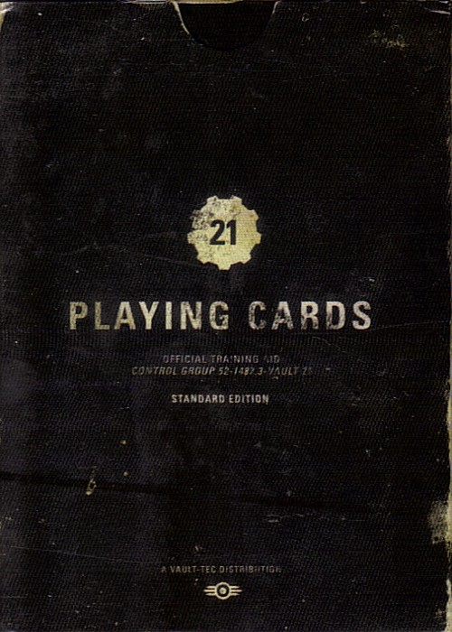 These are the Playing Cards from the FALLOUT New Vegas Collector's Edition set. This distressed look of the Fallout New Vegas items are just the motif they have chosen for all the FALLOUT New Vegas items. The deck contains 55 Cards; 52 playing cards, 2 Jokers and one Caravan rule card. It is printed to resemble a standard Caravan deck with cards representing 7 of the games casinos. These are Vault 21, Ultra-Luxe, Silver Rush, The Tops, Atomic Wrangler casino, Lucky 38, Gomorrah and Bison Steve hotel.