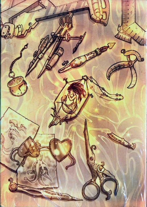 This late nineteenth century fortune-telling deck has illustrated pip cards suggesting their divinatory meanings. In some instances the pips are actually part of the design, which makes “Ye Witches” a partial Transformation Fortune-Telling deck. Some of the period dresses in the illustrations are interesting. An accompanying booklet contains the rules for interpreting the cards and how to use the deck in more detail. The court cards are standard except that their hair is filled in black. The Joker has an image of a horseshoe, rabbit's foot, three four leaf clovers and a broken wishbone.