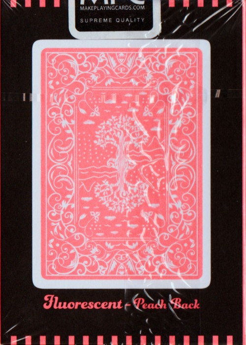 The Peach Edition Fluorescent Playing Cards uses a fluorescent peach pink for both the card front and back as well as on the tuck box.
