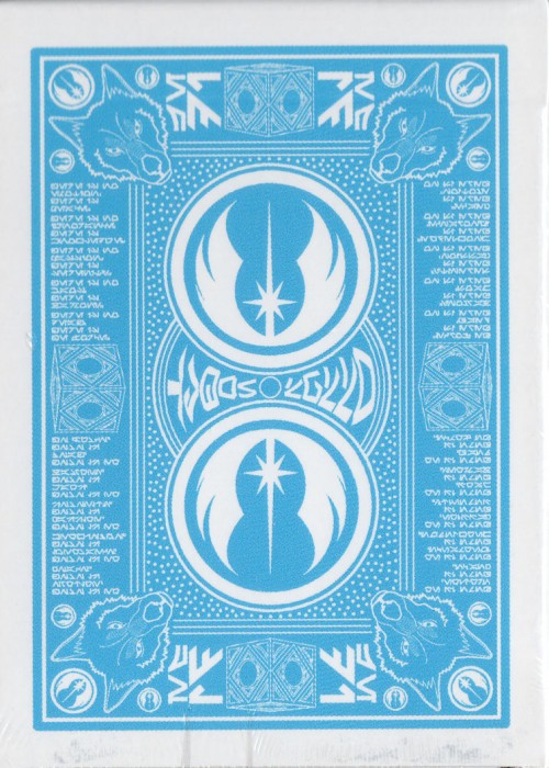 The back of the cards features the Jedi symbol, Jedi holocrons, Loth-wolves, the words Tython and Ossus (two of the ancient Jedi worlds) written in Aurebesh, as well as the entire Jedi code written in Aurebesh.