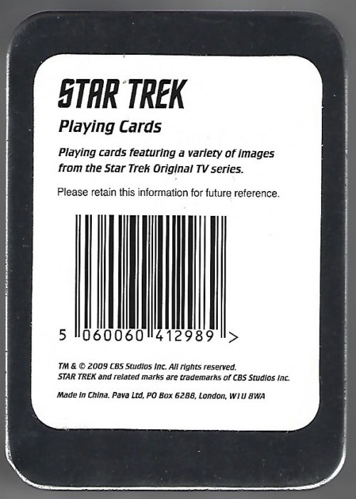 Daniel Vollmer, from Germany, licensed these Star Trek cards to Paramount Pictures. Tricorder Records in Germany produced two versions of STTNG playing cards. One is a boxed set of 2 55-card decks and the other is a single deck poker deck. This is the 2 decks version which consists of 55 playing cards each: 2, 3, 4, 5, 6, 7, 8, 9, 10, Jack, Queen, King, Ace and 3 Jokers. The four colors are: Federation, Klingon, Romulan and Borg.