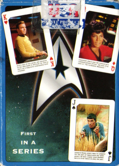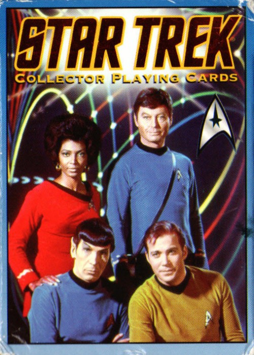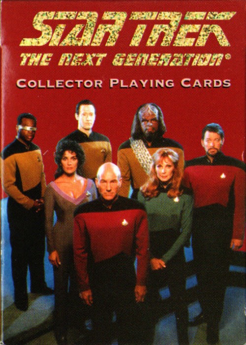 Images show crew, ships and aliens and are different between the two sets. There is a somewhat inconsistent pattern to the cards. Aces are ships. Jacks are characters like Data and Hugh, Queens are women (except for one male Borg), Captain Picard and other Commanders are Kings and the Jokers are Q. The sets were released in 1996.