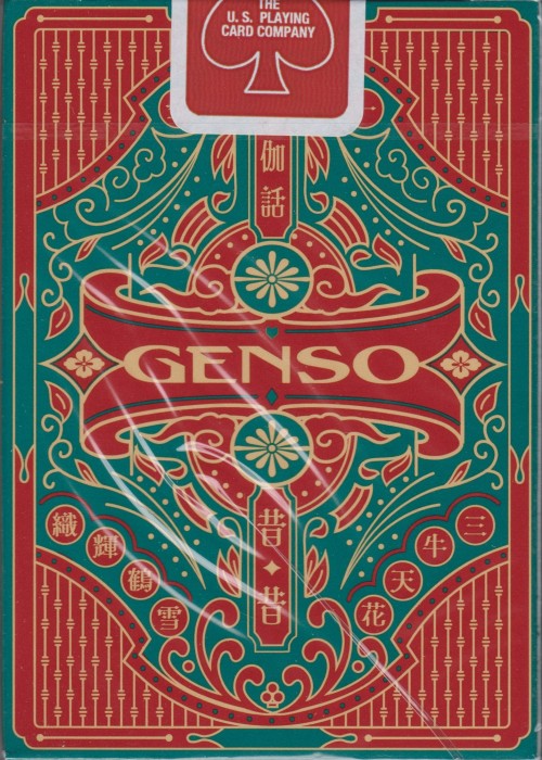 When looking straight ahead, the mask appears frightening and angry; when tilted slightly down, the face of the demon appears to be sorrowful, as though crying. In much the same way, the gold foil mask on the Hannya Playing Cards tuck case emerges from the black mat darkness and peers into your soul.