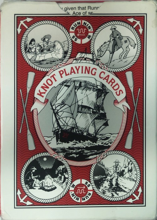 54 instructional cards, each showing instructions for tying a different knot. There is also a series of symbols at the right of each card categorising the knot and its uses, and a simple hint on the right hand side. The name of the knot is at the top and bottom of the cards. The usual pictures for the cards (ex. two vertical spades for the two of spades) show behind the knot instructions in a light grey, except for the ace of spades, which is more prominent. There is two-way artwork of people from the 1800s for the court cards, and the knots instructions are arrayed around them. Spades have knots for horses; Hearts have knots for camping; Clubs have knots for boating and fishing; Diamonds have knots for climbing. The backs have a border and are one-way, as pictured on the back of the tuck box. The jokers are different and feature decorative knots with a cartoon cowboy fishing in different poses. There are two additional instructional cards with words on the front and back.
