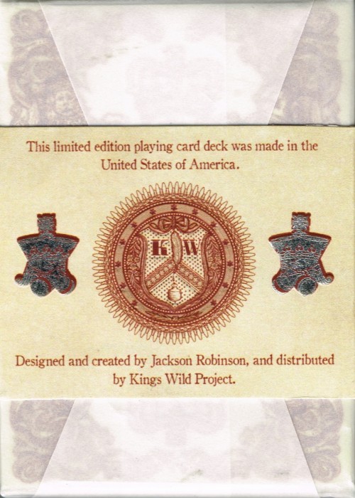 General Admission was the Kings Wild Shorts Subscription deck for May, 2020. The design inspiration for this unique deck came from Jackson's draw towards vintage ticket stubs from the early 20th century. Printed by EPCC, the semi-gloss tuck case resembles the layout of a ticket stub, including the gate number, section, row, and seat, which hide an Easter Egg for those who follow Jackson's design themes closely. The complex back design plays along the same lines, adding design elements resembling some of Kings Wild's currency decks, along with the iconic logo.