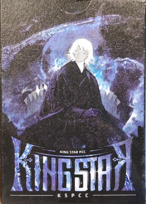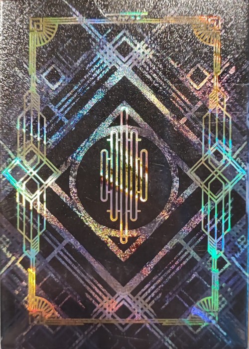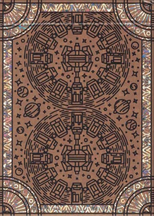 We use an ultra-thin mylar, or full foil, laminated on both sides. The card backs are a new holographic full foil pattern, and the faces are standard silver. Like Pokemon cards, both feature overprinting at different opacities to block out the shiny effects of the full foil. The only difference between these and trading cards is our decks spring, fan, and handle like a normal deck of playing cards! A designers dream, and totally out of this world technology for future playing card decks.