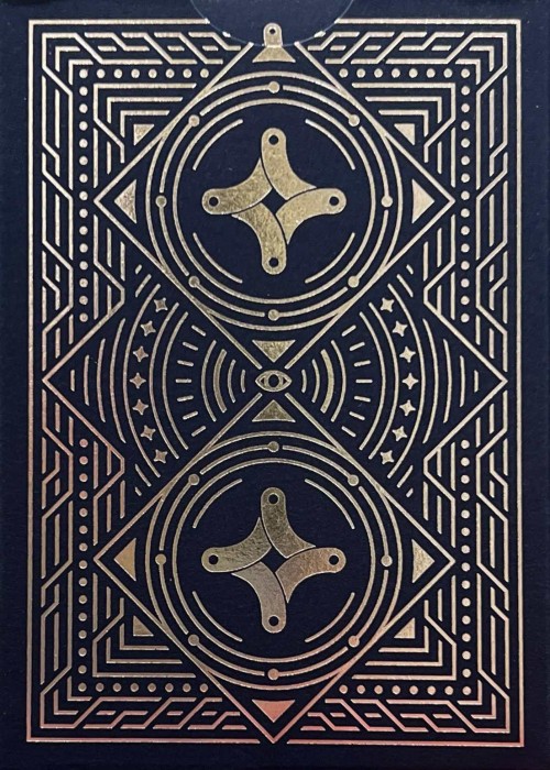 The tuck box is made of matte navy blue with metallic silver hot foiling. The cards are printed by USPCC - featuring pure silver metallic ink on the artworks.