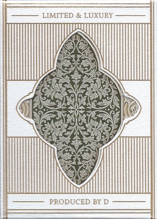 The tuck box is a double box structure. The outer box features a die-cut window which showcase the box inside and you can slide your finger inside to slide out the box. The inner box is the deck case, which holds the cards. The box is made with premium pearl paper matte stock with metallic foil stamping. Also, there is a numbered seal on the top of the box.