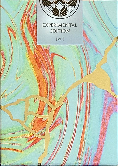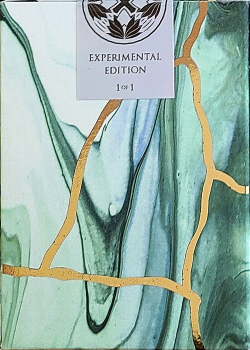 This deck is printed with a unique dimpled high gloss finish showcasing the design below along with a shimmering gold foil that showcases the cracks and repairs of the deck. The cards inside feature an animated blooming back design that when flipped will show the logo flowering and closing with the different seasons. The deck gilding is made to match the tuck. The two piece Jokers showcase a piece of the card falling off with the repair paint revealing a ‘J’ to complete the Joker titling. The AoS follows similar in suit with a “broken” face revealing the spade shape with a custom pattern to match the back design and the ‘Experimental Series’ tag below.