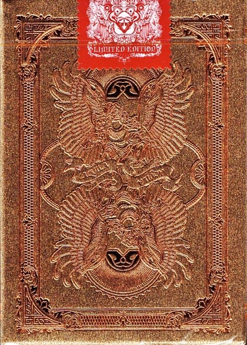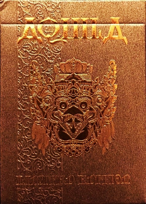 Funded as a Kickstarter project on May 23, 2014 with $27,421 pledged from 588 backers, this was a two deck set consisting of both a Standard and Limited Edition. Designed by Ade Suryana and produced by Kardify Projects, this deck features the theme of Aquila (Latin for eagle) which was inspired by the Garuda Wisnu Kencana in Bali, Indonesia, that is a large mythical bird with eagle-like features has been featured in many cultural and religious mythologies. This PCDB Entry is for the Limited Edition deck. https://www.kickstarter.com/projects/kardify/aquila-playing-cards Aquila also tied for winning the Best Pips award from UnitedCardists 2014 Deck of the Year http://unitedcardists.com/viewtopic.php?f=8&t=6448