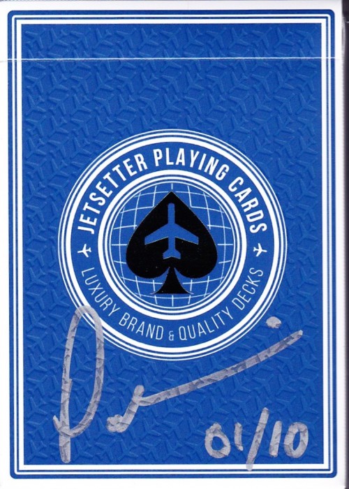 The tuck case will have a vintage and classy feel with modern appeal. Once in your hand, at the right angle, you'll notice a clear UV spot coating creatively applied as the pattern of airplanes found on the front of the tuck. Furthermore, it will be produced with exclusive synthetic stock providing durability beyond your standard tuck case that plagues your everyday deck - perfect for traveling. The back design of the playing cards will showcase the Altitude Blue colorway with the same airplane pattern as the original Luxury Edition deck. We've added our new Jetsetter Playing Cards logo to the back design in the traditional two-way casino-style. Additionally, the custom Ace of Spades will prominently exhibit that same new logo.