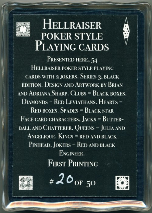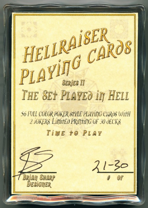 This is the first run of 50 decks. Each set comes enclosed in a plastic black labeled case with a protective red velvet bag and a certificate of authenticity. These are a completely playable deck of 52 poker style playing cards with 2 jokers. All cards are unique, and beautifully detailed in Hellraising fashion. Each deck has 4 easy to distinguish suits based on the lament configuration that any Hellraiser/ Clive Barker fan would enjoy. Face cards are all cenobites! Find Butter ball, Chatterer, Pinhead and others! Break these out at your next poker game, and see what doors they unlock!
