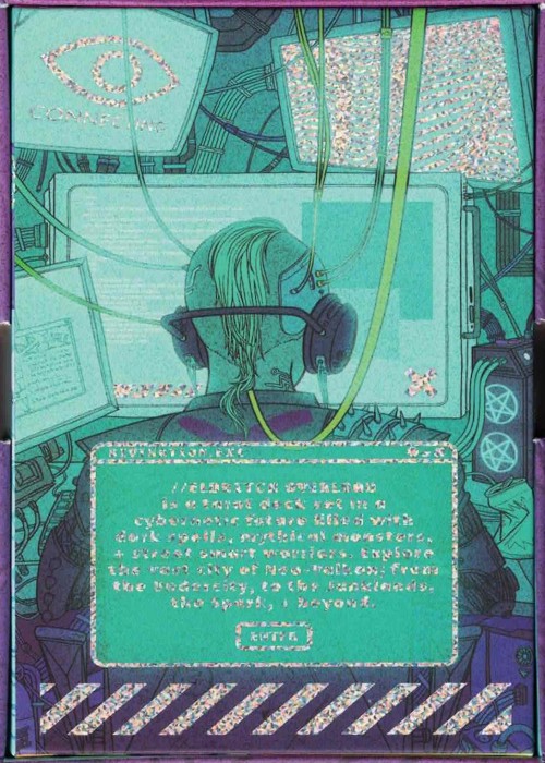 Identities, payments, gear patents, life reboots, secrets... Our back cards were inspired by the central AI in which everyone and everything is connected in Cybercity. Every Cyberware is somehow connected to the core, so our dependency on the machine never ends.