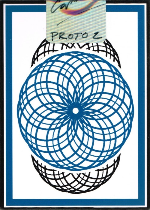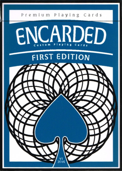 Here we have a 1 of 1, second prototype of the Encarded Standards tuck box. This was printed at Encarded HQ, hand-cut and assembled. I initially had planned on using quite a lot of black in the box design, but after a number of experiments I decided that it made the box too visually "heavy" and I simplified it back to the single color and foil you see in the production deck.